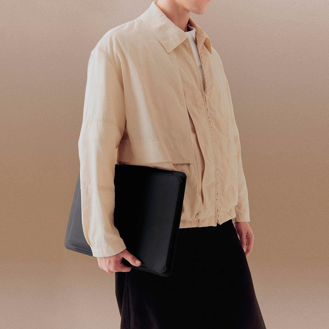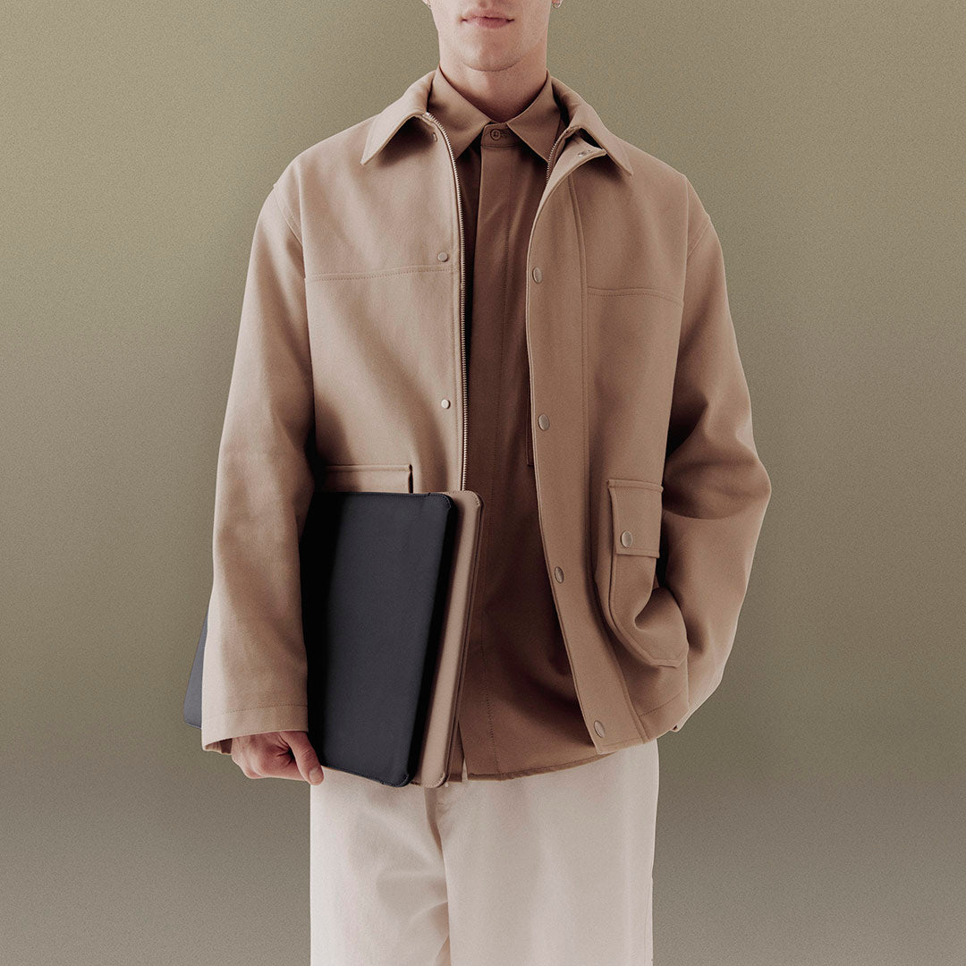 It fits like a second skin and offers essential protection for your laptop. Sora Sleeve closes with a perfectly crafted magnetic fastener so that nothing falls out, even upside down. The closed-cell foam absorbs shocks, while the soft felt from recycled textiles allows your laptop to glide smoothly inside. On the outside, waterproof material protects against splashing water and doubles as a helpful mouse pad.
