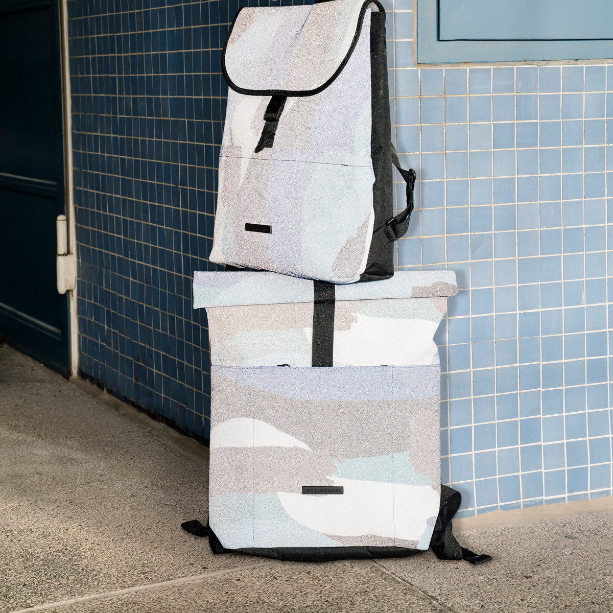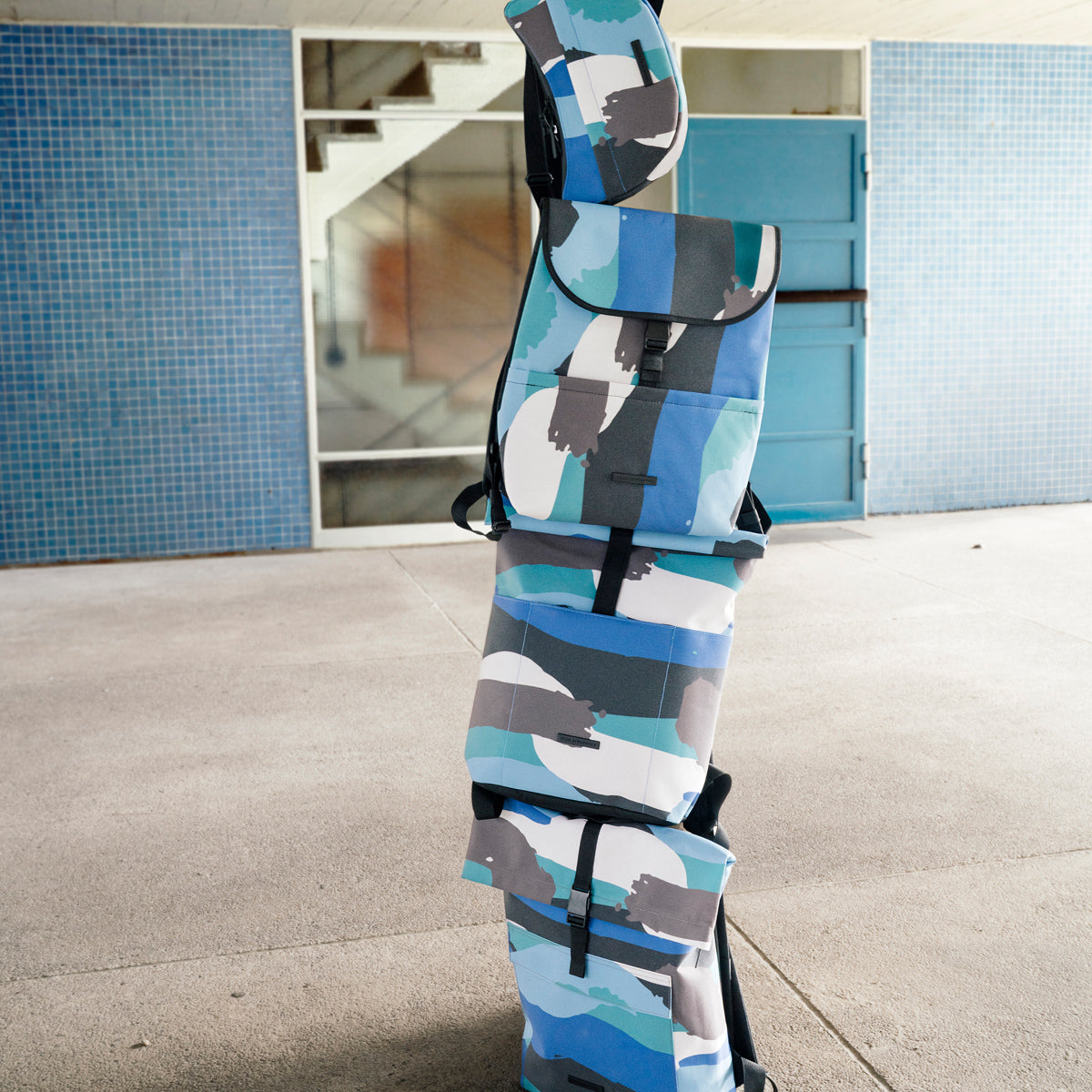 The main material is printed using a high-resolution sublimation process designed by one of our favorite and talented designers. Felix van Dam and Winneke de Groot are two graphic designers from Utrecht (Holland) who run the studio 'We are out of office' together. Their artwork for Ucon Acrobatics can be described as a dynamic interplay of abstract forms and muted colors. The piece captures a rhythmic flow through broad, painterly strokes that intertwine and overlap, creating a sense of movement and fluidity. The palette, dominated by cool blues and earthy tones, adds a serene, almost meditative quality to the composition.