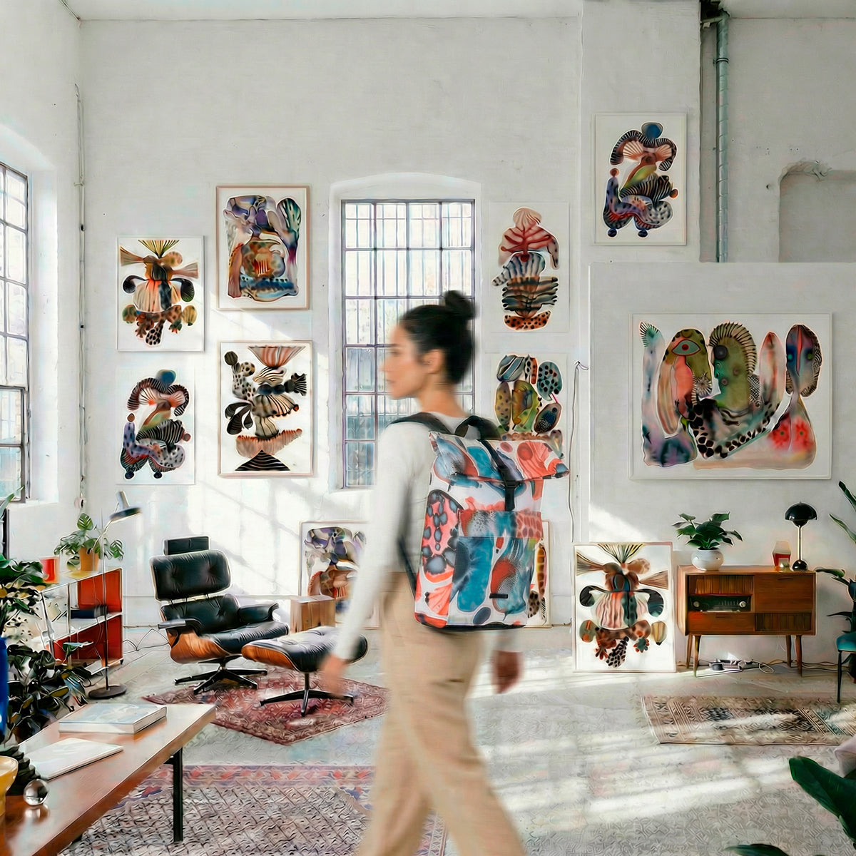 The main material is printed using a high-resolution sublimation process designed by Emma Larsson, who lives and works in Stockholm (Sweden) and is a contemporary artist primarily working in watercolor. Her biomorphic compositions move between abstraction and figuration, recalling organic structures, cellular forms, and imagined organisms. Through richly pigmented gradients and controlled water movement, she develops hybrid forms in which soft transitions meet graphic elements such as stripes and dots. The works stand independently within open space, unfolding their impact through the tension between fluid color and defined structure.