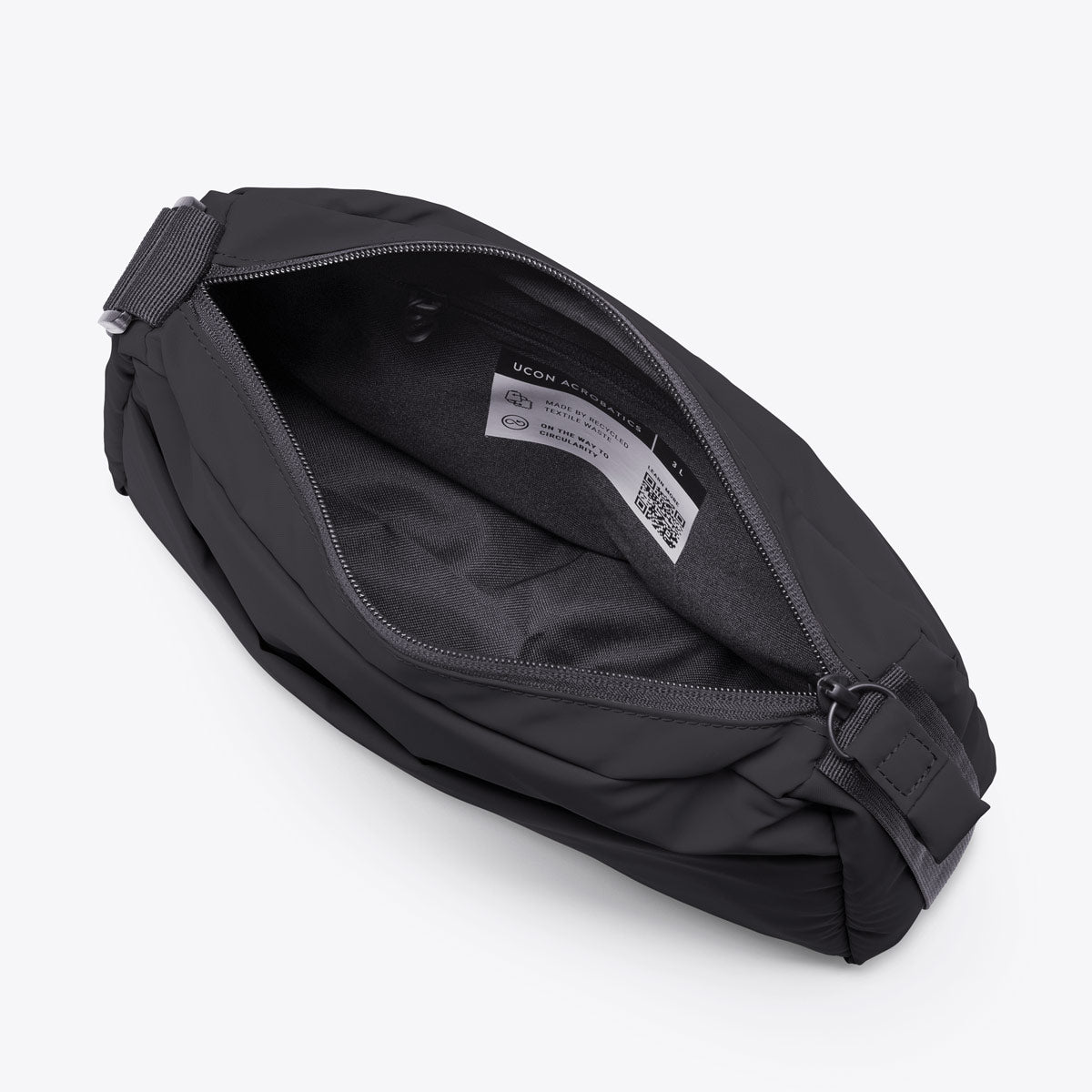 This method is an open-loop process that uses textile waste from the fashion industry with a high polyester content already dyed. These are mainly scraps from sewing factories, downcycled into thick felt elements with little effort and used in invisible areas of the backpack. Such mixed textiles are hard to recycle and often end up in landfills or get burned.