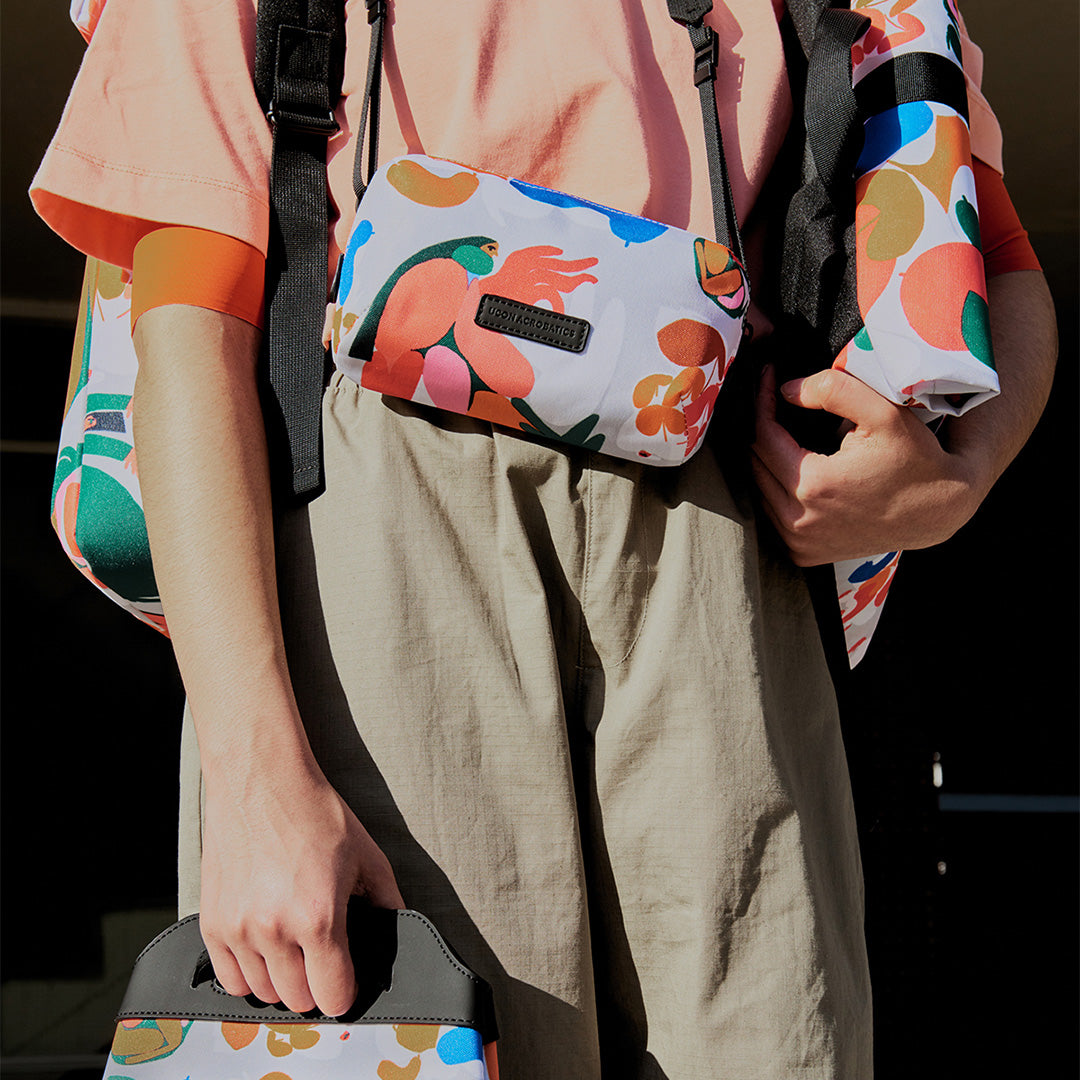 The main material is printed using a high-resolution sublimation process, designed by one of our most favourite and talented artists. Amber Vittoria is an NYC-based artist and poet. Her artwork for Ucon Acrobatics reflects her signature style of abstract, fluid shapes combined with bold, vibrant colors. The design is both playful and dynamic, using organic forms of abstract persons that intertwine in a harmonious yet energetic composition. The color palette is rich, with contrasting yet complementary tones of green, orange, pink, and blue, creating a visually striking piece that feels modern and expressive.