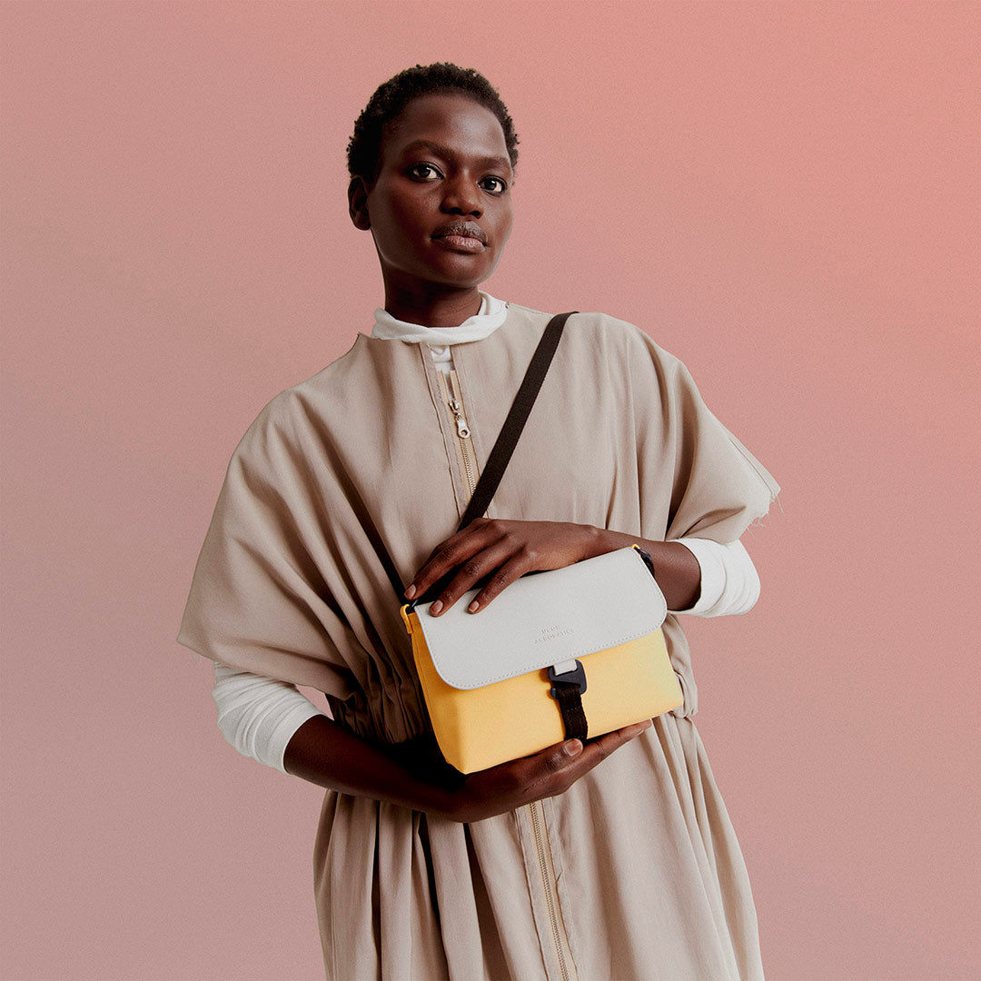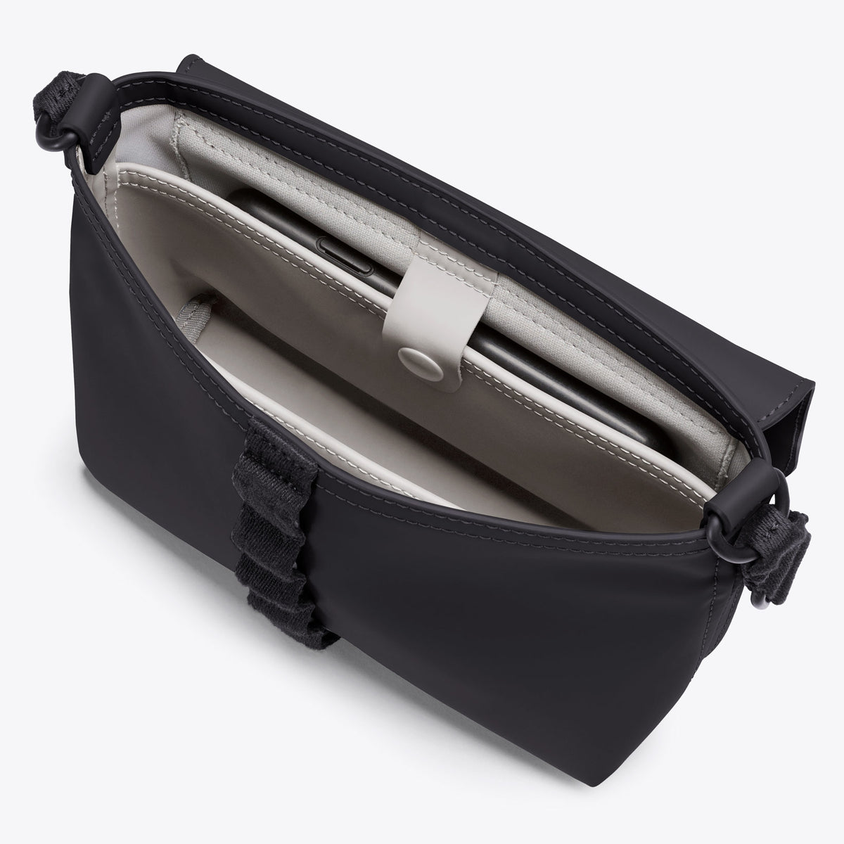 This shoulder bag is a cool and secure companion for day and night. Yuri Bag closes with a flap fastener secured with an aluminum buckle. The interior has enough space for essentials, such as a wallet and keys, and two additional pockets. There is a quick-access pocket for your smartphone on the back. Thanks to the adjustable shoulder strap, the bag can be carried comfortably over the shoulder, as a shoulder bag or casually in the hand.